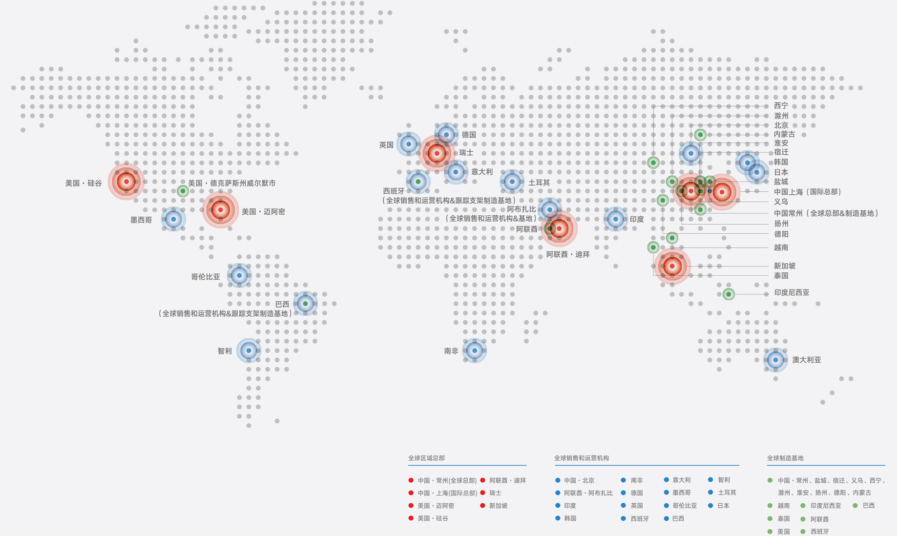 全球化是天合光能的战略,天合光能早年便开始了全球化布局,天合光能起步于江苏常州并在此设立了全球总部,2022年,天合光能又在上海设立了国际总部,积极加强全球化人才队伍建设,近年来引进了来自70多个国家和地区的国际化高层次管理和研发人才。公司在瑞士苏黎世、美国硅谷、美国迈阿密、新加坡、阿联酋迪拜设立了区域总部,并在马德里、墨西哥、悉尼、罗马等地设立了办事处和分公司,在泰国、越南、美国、印度尼西亚、阿联酋建立生产制造基地,业务遍布全球170多个国家和地区。