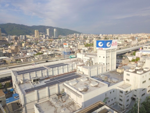 白鶴酒造本店三号工場全景。3階と4階の屋上に太陽光発電パネルを並べている。北側に六甲山が連なる(写真:トリナ・ソーラー・ジャパン)