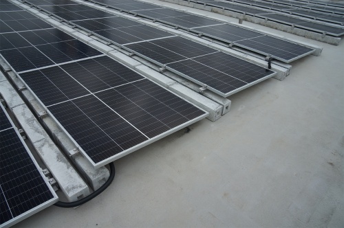 屋上にずらりと並んだ太陽光発電パネルを見て気付くのは、屋上面をはうように低く、また水平に近い緩勾配で設置していることだ。これは、設置する屋上部分の条件に対応した選択だった。