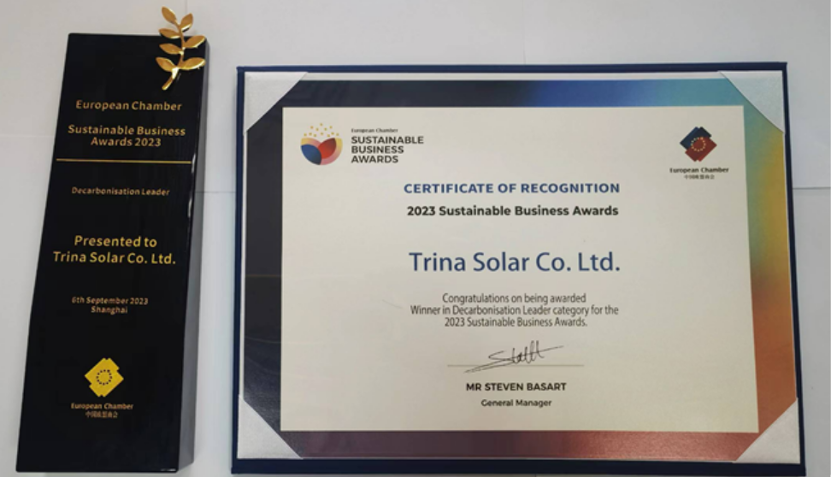 The European Union Chamber of Commerce in China has honored Trina Solar with the title of Decarbonisation Leader for its achievements in low-carbon transition and climate change mitigation. The company received the award at the 2023 Sustainable Business Awards conference and ceremony in Shanghai on Sept 6. The award recognises Trina Solar’s exceptional decarbonisation performance at a business operations level and is a testament to its contribution to achieving the climate ambitions set out in the Paris Agreement of 2015.