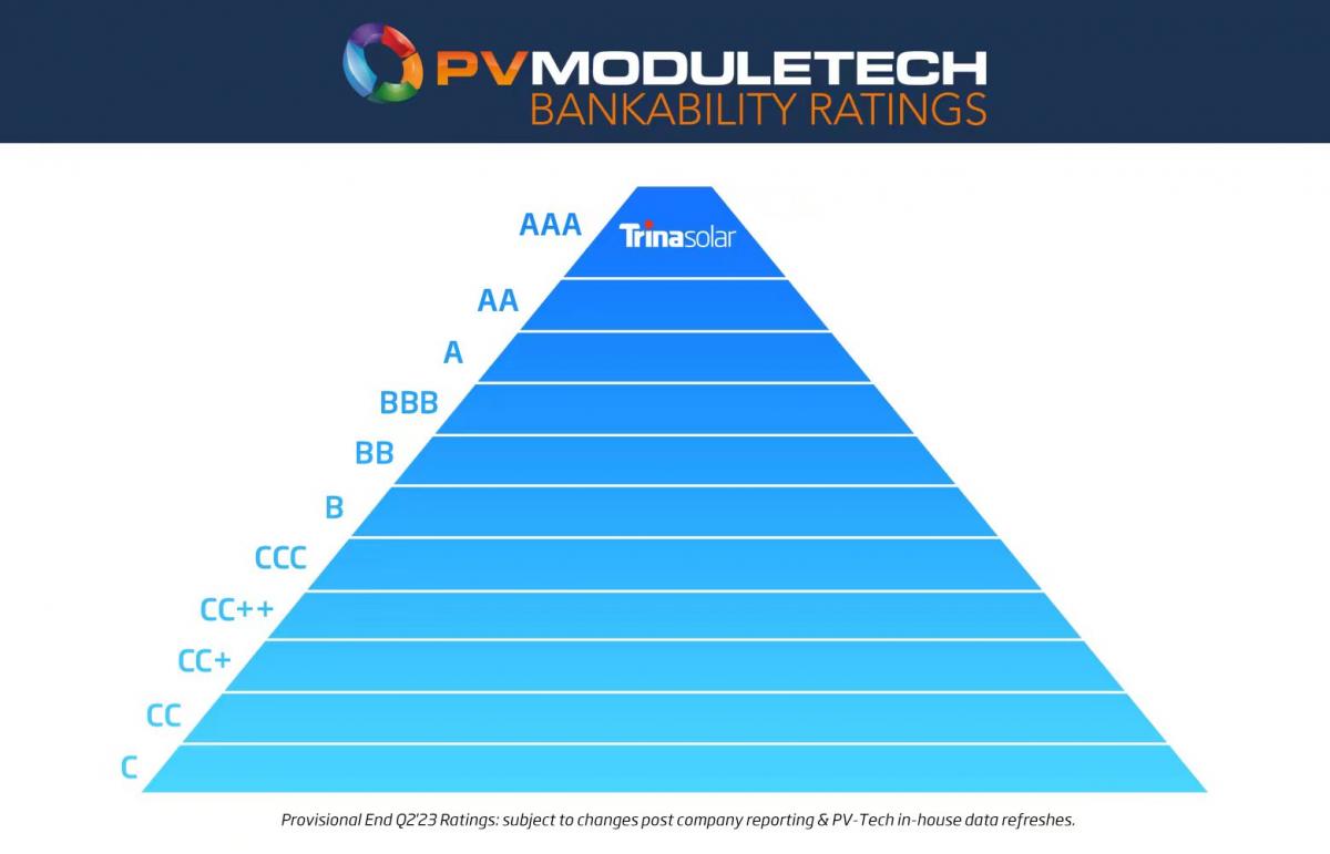 Trina Solar has been ranked in the top AAA category for the fifth consecutive quarter in PV Tech’s PV ModuleTech Bankability Ratings for Q2’2023, underlining the company’s leadership status in high reliability, advanced technology, shipments, and sound financial performance.